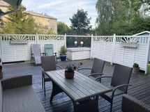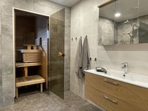 Kylpyhuone ja sauna ovat hiljattain täysin remontoitu, ja saunaosastolta on suora kulku suurelle terassille. Terassilla voi rentoutua saunan jälkeen tai nauttia kesäiltoina grillauksesta perheen ja ystävien kanssa.