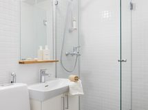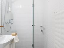 - Varusteet: peili, WC, suihku, suihkuseinä, kiinteät valaisimet, lattialämmitys, pesukoneliitäntä, allaskaappi