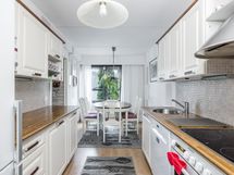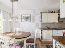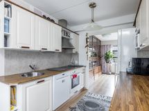 - Keittiön varusteet: Jääkaappipakastin, uuni, erillisuuni, liesi, liesituuletin ja astianpesukone. Liesi: Keraaminen liesi. Työtason materiaali: Laminaatti.