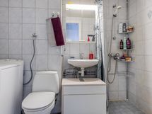 Pesutilojen varusteet: Suihku, peilikaappi, pesukoneliitäntä ja wc-istuin. Pesutilojen kuvaus: Kylpyhuone remontoitu taloyhtiön toimesta 2003.