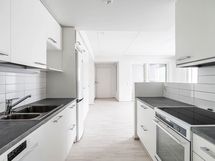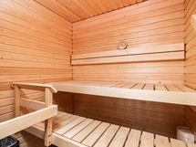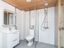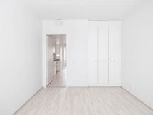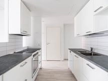 Keittiö sijoittuu omaksi rauhalliseksi työskentelyalueekseen ja tarjoaa hyvin kaappitilaa. Kaksi makuuhuonetta löytyvät erillisinä ja helposti sisustettavina tiloina. Laatoitettu kylpyhuone ja oma sauna muodostavat selkeän ja siistin kokonaisuuden peseytymistä ja rentoutumista varten.