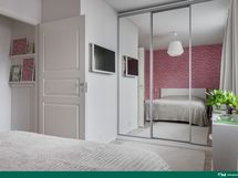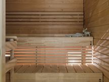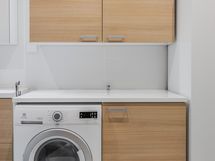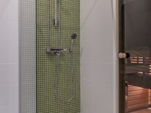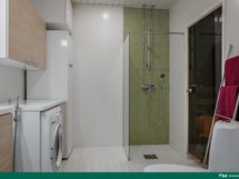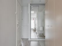 - Kylpyhuone, suihku, suihkuseinä, peilikaappi, allaskaappi, kylpyhuonekaapisto, pesukoneliitäntä, kiinteät valaisimet, lattialämmitys, sähkösauna. Lattia: Laatta. Seinät: Laatta
