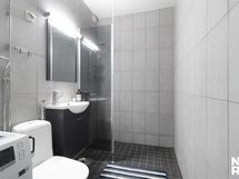 Pesutilojen kuvaus: Rättipatteri, allaskaappi. Varustus: suihkuseinä, pesukoneliitäntä, wc-istuin, suihku, peili.