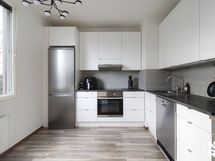 Liesi: keraaminen. Työtasot: laminaatti. Kylmäsäilytys: jääkaappi/pakastin. Varustus: liesituuletin, astianpesukone.