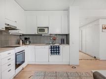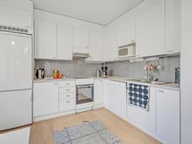 Keittiön varusteet: Jääkaappipakastin, astianpesukone, liesi ja liesituuletin. Liesi: Keraaminen liesi. Työtason materiaali: Laminaatti.