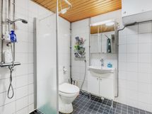 Pesutilojen varusteet: WC-istuin, bidee-suihku, lattialämmitys, peilikaappi, suihku, pesukoneliitäntä ja suihkuseinä.