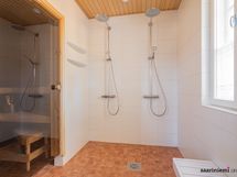 - Pesutilojen kuvaus: Saunan yhteydessä olevassa pesuhuoneessa on kaksi Grohen katto- ja käsisuihkua sekä erillinen hana löylyvettä varten (+ liitäntä pesualtaalle).