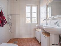 Lisäksi yläkerrassa on kylpyhuone, jonka varustus on: suihku (Oras), wc-istuin (Ido Seven), peili, kaksi Villeroy & Bochin pesuallasta, Grohen hana ja bidee-suihku sekä kaapisto. Erillisten WC:n lukumäärä: 2. Erillisen WC:n kuvaus: Ensimmäisen kerroksen ja kellarin wc:n lisäksi myös yläkerran kylpyhuoneessa on wc.