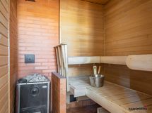 - Kiuas: Puukiuas ja sähkörasiavaraus sähkökiukaalle. Saunan seinät on leppäpaneelia ja Tiilerin tiiltä. Lattian laatat on Laattapisteestä.