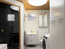 - Pesutilojen kuvaus: Tilava ikkunallinen kylpyhuone. Suihku, wc-istuin, allaskaluste, peilikaappi, pesukoneliitäntä, tila pesutornille.