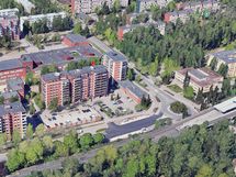 - Länteen pihapiiriin, jossa grillauspiste ja keinut. Myyrmäenraitti kävelykatu sekä sen takana koulurakennus. Idän suunnassa näkymä parkkialueelle jonka takana Myyrmäentie ja sen takana paikallisjunan raiteet sekä Louhelan juna-asema.