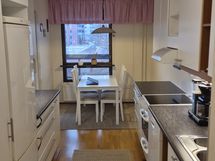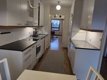 - Paljon kaappitilaa, Suuri tiskipöytä, Laminaattitasot, Terästasot, Astianpesukone, Pesukoneliitos, Sähköliesi, Liesituuletin, Jää-pakastinkaappi. Keittiössä tilaa ruokapöydälle ja 4:lle tuolille.
