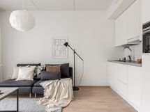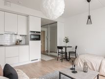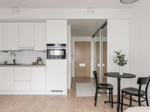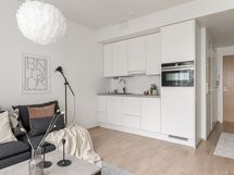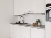- Keittiön varusteet: Jääkaappi, yhdistelmäuuni (sis. mikro), liesituuletin ja astianpesukone. Liesi: Induktioliesi.