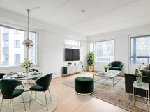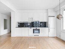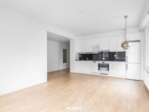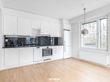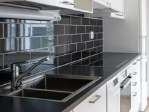 - Keittiön varusteet: Jääkaappipakastin, liesi, liesituuletin, uuni ja astianpesukone. Liesi: Keraaminen liesi. Työtason materiaali: Laminaatti.