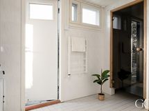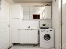- Pesutilojen kuvaus: Suuri kylpyhuone, jossa on peilikaapit, kaapistot, pesuallas, hana ja 2 x rättipatteri, pesukoneliitäntä ja