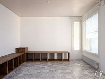 astianpesupesukone, kaapistot, laminaattitaso, laminaattilattia. Ruokailutilassa on puupenkit.