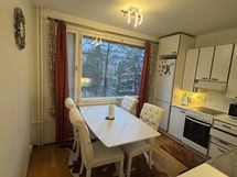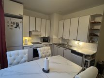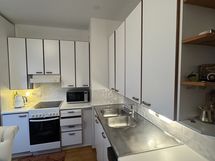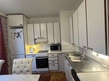 Valoisa ja vaalea keittiö, johon mahtuu 4 hengen ruokapöytä ja tuolit. Keittiössä keraaminen liesi, uuni, uusi astianpesukone ja jääkaappi-pakastin.