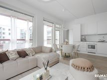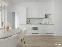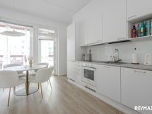Keittiön varusteet: Jääkaappipakastin, uuni, liesi, liesikupu ja astianpesukone. Liesi: Induktioliesi. Työtason materiaali: Laminaatti.