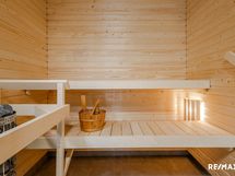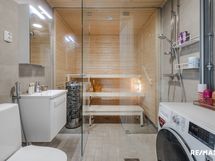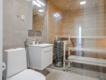 Asunnon kruunaa oma sauna, jossa voi rentoutua päivän päätteeksi. Lisäksi asunnossa on etelään suuntautuva valtava lasitettu parveke, joka tuo mukavasti lisätilaa ja valoa. Kylpyhuone on tyylikäs ja käytännöllinen. Saunan ja pesuhuoneen jakaa tyylikäs lasiseinä.