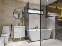 - Varusteet: kaksi suihkua, suihkuseinä, WC, allaskaappi, peili, kylpyamme, lattialämmitys. WC: yksi erillinen wc ja toinen wc kylpyhuoneessa. Varusteet: lattiaan asennettu WC, bidee, lattialämmitys, allaskaappi, peili