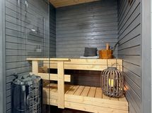 - Kiuas: Sähkökiuas. Koko saunan levyinen lasiseinä ja pilarikiuas tuovat oman elämyksen saunomiseen. Saunat seinät ja lauteet käsitelty saunavahalla. Seinät puuta ja lattia laattaa.