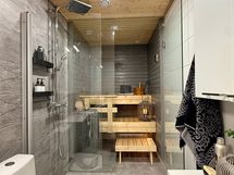 - Pesutilojen kuvaus: Tyylikäs kylpyhuone on kuin pieni spa-keidas. Saunan väliseinä on kokonaan lasia ja ihana sadesuihku on ripaus ylellisyyttä. Tehosteseinä on samanvärinen kuin lattia, joka on tarkkaan harkittu yksityiskohta. Varustuksena: sadesuihku, kääntyvä suihkuseinä, peili- ja allaskaappi, lisäseinäkaapit, wc-istuin ja pesukoneliitäntä. Seinälaatat kokoa 25x40cm ja lattialaatat 10x10cm.