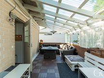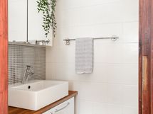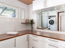 - Pesutilojen kuvaus: Tyylikkäässä kylpyhuoneessa on suihku ja lasinen suihkuseinä, kaakeloidut seinät ja lattialämmitys. Kylpyhuoneen yhteydessä sijaitsee käytännöllinen kodinhoitotila, jossa on runsaasti laskutilaa, pesukoneliitäntä ja säilytyskaapistot. Erillisten WC:n lukumäärä: 1. Erillisen WC:n kuvaus: Erillisessä WC:ssä on laattalattia, käsienpesuallas allaskaapilla, peilikaappi, hylly sekä WC-istuin.