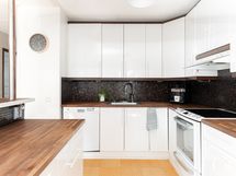 - Avokeittiössä on saareke, runsaasti kaappitilaa sekä puupintaiset työtasot. Varusteluun kuuluu jääkaappi, pakastin, uuni, liesituuletin ja astianpesukone. Lattia on parkettia.