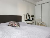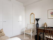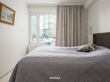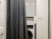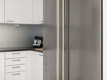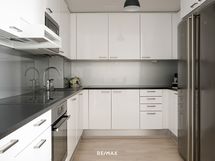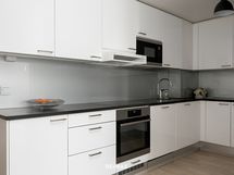 - Tilavassa keittiössä runsaasti kaapisto- ja laatikostotilaa, työtasot laminaattia, integroidut mikroaaltouuni, kiertoilmauuni, liesi ja astianpesukone, jääkaappi ja pakastinkaappi, liesituuletin, lattia valkolakattua tammiparkettia ja seinät maalattu. Kaikki kodinkoneet AEG.