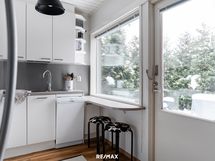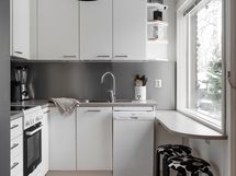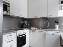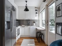 - Keittiön varusteet: Astianpesukone, erillisuuni, liesi, liesituuletin ja side by side -jääkaappipakastin, tilavaraus mikroaaltouunille. Liesi: Keraaminen liesi. Työtason materiaali: Puu. Kaunis ja kompakti avokeittiö jossa iso ikkuna tuomassa lisää tilan tuntua. Keittiöstä käynti kodin terassipihalle.