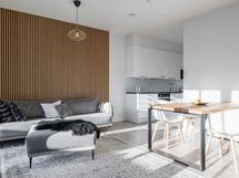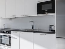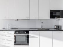 Varusteet: jääkaappipakastin, astianpesukone. Työtaso: kivitaso. Liesi: mikroaaltouuni, induktioliesi. avokeittiö