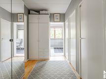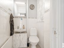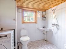 Kylpyhuoneesta käynti ulos. Varustus: pesukoneliitäntä, lattialämmitys, wc-istuin, suihku. Varustus: peilikaappi.