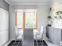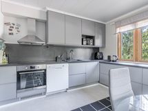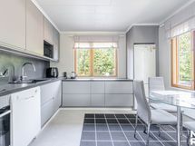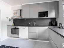 Liesi: induktio. Työtasot: laminaatti. Kylmäsäilytys: jääkaappi/pakastin. Varustus: astianpesukone, liesituuletin / hormi.