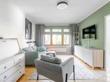 Lattia: Keittiössä: muovi. Pesutiloissa: laatta. Erillisessä WC:ssä: laatta. Olohuoneessa: parketti. Makuuhuoneessa: parketti, laminaatti. Seinät: Keittiössä: maalattu. Pesutiloissa: maalattu, osalaatoitus. Erillisessä WC:ssä: tapetti, osalaatoitus. Olohuoneessa: maalattu. Makuuhuoneessa: maalattu.