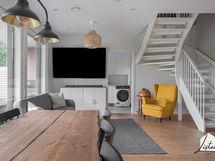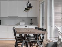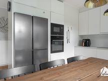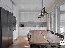 - Keittiön varusteet: Jääkaappi, pakastekaappi, erillisuuni (integroitu), mikroaaltouuni (integroitu) ja astianpesukone. Liesi: Induktioliesi. Työtason materiaali: Kivi.