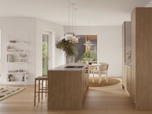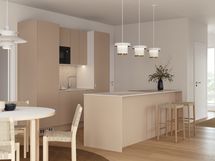 Keittiössä kashmeren sävyiset kaapin ovet ja vaalea työtaso. Kodinkoneet integroidut. Saareke tuo lisätilaa keittiöön.