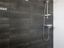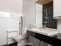 - Pesutilojen kuvaus: Alakerran tilavassa kylpyhuoneessa wc-istuin, lattia ja seinät laattaa, suihku, allas, allaskaapisto, peili, kaapisto, käsisuihku, vesikiertoinen lattialämmitys.