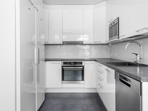 - Keittiön varusteet: Jääkaappi, erillinen pakastin, erillisuuni, liesi, mikroaaltouuni, liesituuletin ja astianpesukone. Liesi: Induktioliesi. Työtason materiaali: Laminaatti.
