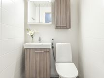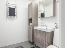 - Pesutilojen kuvaus: Pesuhuone remontoitu yhtiön toimensta tammi-helmikuussa 2026: 2 x sadesuihku, pyyhekuivain ja pesukoneliitäntä. Lattiassa sähköinen lattialämmitys. Erillisen WC:n kuvaus: Yläkerta: peilikaappi, allas, allaslaatikosto, korkea kaappi, wc-istuin, käsisuihku ja
