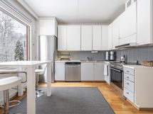 - Kaapistot, jääkaappi/pakastin, astianpesukone, keraaminen liesi, liesituuletin (ei hormiin). Erillinen kylmiötila (ei kylmiö käytössä).