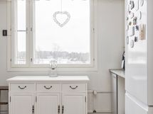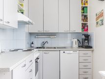 - Keittiön varusteet: Jääkaappipakastin, astianpesukone, liesituuletin ja uuni. Liesi: Sähköhella. Työtason materiaali: Laminaatti.