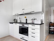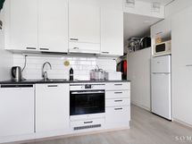 - Keittiön varusteet: Jääkaappipakastin, erillisuuni, liesituuletin ja astianpesukone. Liesi: Keraaminen liesi. Työtason materiaali: Laminaatti.