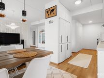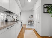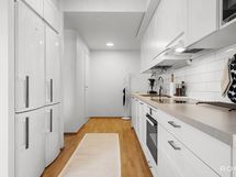 - Keittiön varusteet: Jääkaappi, erillinen pakastin, erillisuuni, liesi, liesituuletin ja astianpesukone. Liesi: Induktioliesi. Työtason materiaali: Laminaatti.