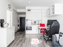 Kodin pohjaratkaisu on erittäin valoisa ja tehokas. Kodin sydän on suuri oleskelutila, jossa yhdistyy olohuone ja moderni keittiö liikuteltavalla saarekkeella. Saareke on varustettu pyörillä, joten liikutat saarekkeen kätevästi haluamaasi kohtaan. Sisustuksen laadusta kertovat integroidut kodinkoneet ja laadukkaat keittiö- ja kylpyhuoneratkaisut. Asunnon lämmönjakotapana vesikiertoinen lattialämmitys, joka mahdollistaa korkeat ikkunat ja helpottaa sisustamista, kun perinteisiä seinäpattereita ei ole. Tilaa oleskelutilassa on reilusti suurellekin ruokapöydälle ja sohvaryhmälle. Oleskelutila jatkuu huoneiston levyiselle lasitetulle parvekkeelle, josta on avarat näkymät sisäpihalle länteen. Makuuhuoneessa on säilytystilaa hyvin kaapistossa ja tilaa on reilusti parisängylle sekä meikkaus- tai työpisteelle. Runsaasti lisää säilytystilaa löydät eteisen kaapistoista ja lämpimästä irtaimistovarastosta.