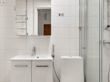 - Suihku/suihkuseinät, peilikaappi, pesukoneliitäntä, lattialämmitys, kiinteät valaisimet. Lattia: Laatta. Seinät: Laatta