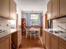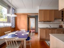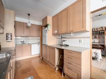 - Korkkilattia, levytetyt seinät, välitilassa laatta, työtasot laminaatti, keraaminen liesi, erillisuuni, astianpesukone, liesituuletin, jääkaappi