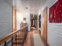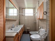 Yläkerran kylpyhuone: Laattalattia, seinät kaakeli, 2 pesuallasta, 2 peilikaappia, kattolämmitys, bideeallas, wc-istuin, suihku. Erillisten WC:n lukumäärä: 3. Erillisen WC:n kuvaus: Alakerran wc: Muovimatto, tiiliseinät, maalatut seinät, peili, wc-istuin, pesuallas