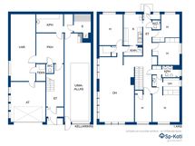 - Pesutilojen kuvaus: Alakerran kylpyhuone: Laattalattia, seinät kaakeli, lattialämmitys, kylpyamme, peili, pesukoneliitäntä, suihku, suihkuseinä, pesuallas