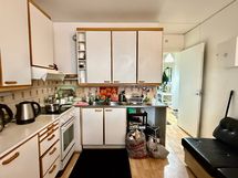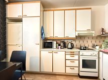 - Keittiön varusteet: Jääkaappipakastin, uuni, liesi, liesituuletin ja paikka astianpesukoneelle. Liesi: Keraaminen liesi.
