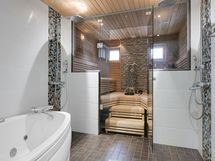 - Suihku, Vesikiertoinen lattialämmitys, Poreallas, Käsisuihku, Kaapisto, Allas, Suihkuseinä, WC-istuin, Peili